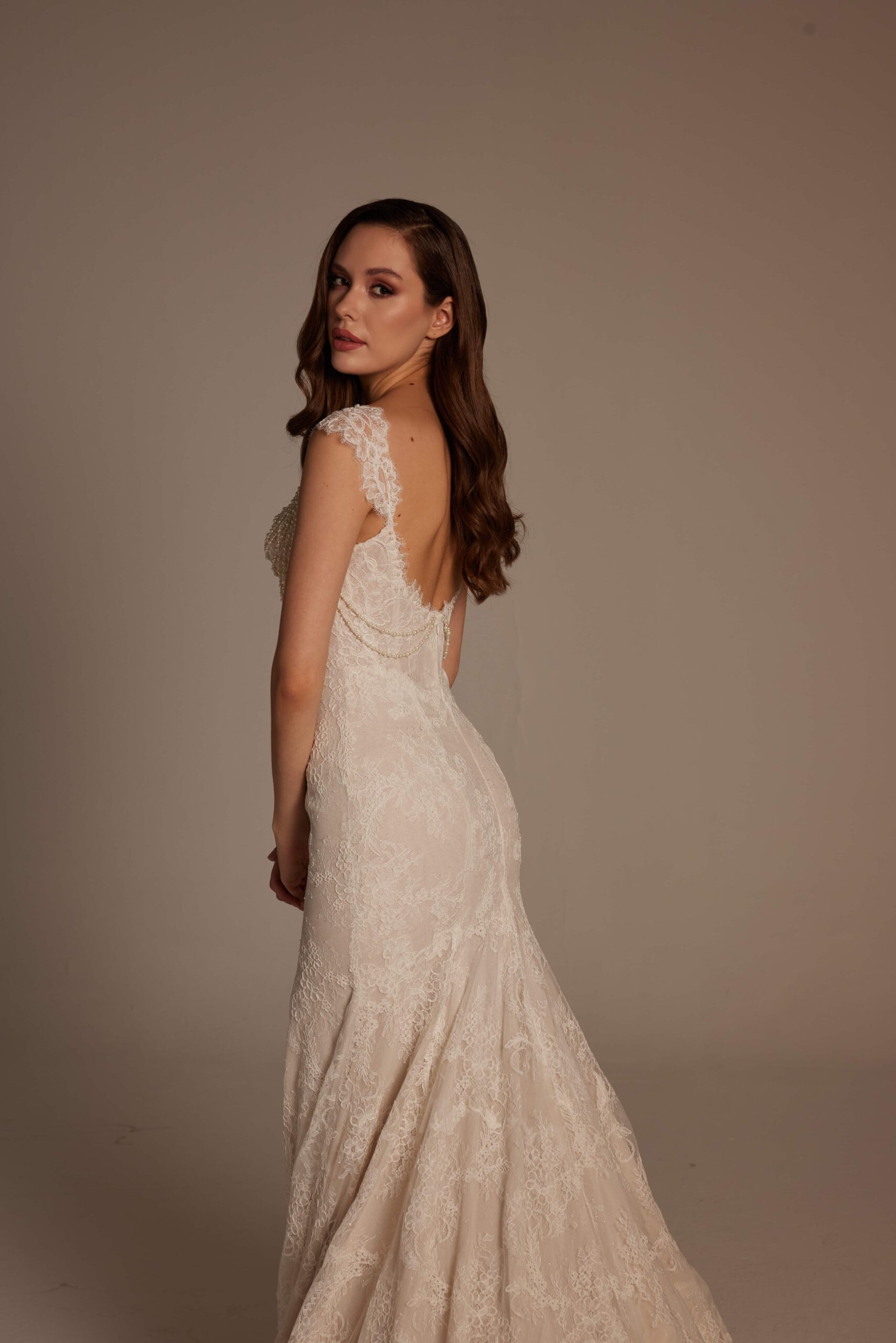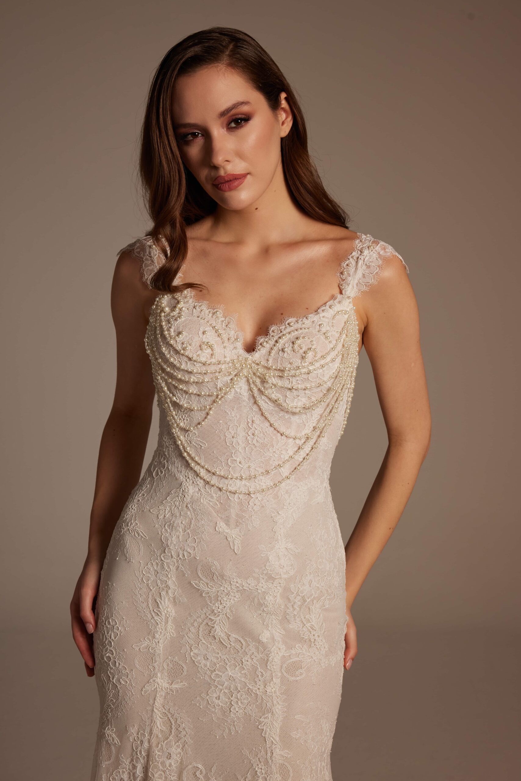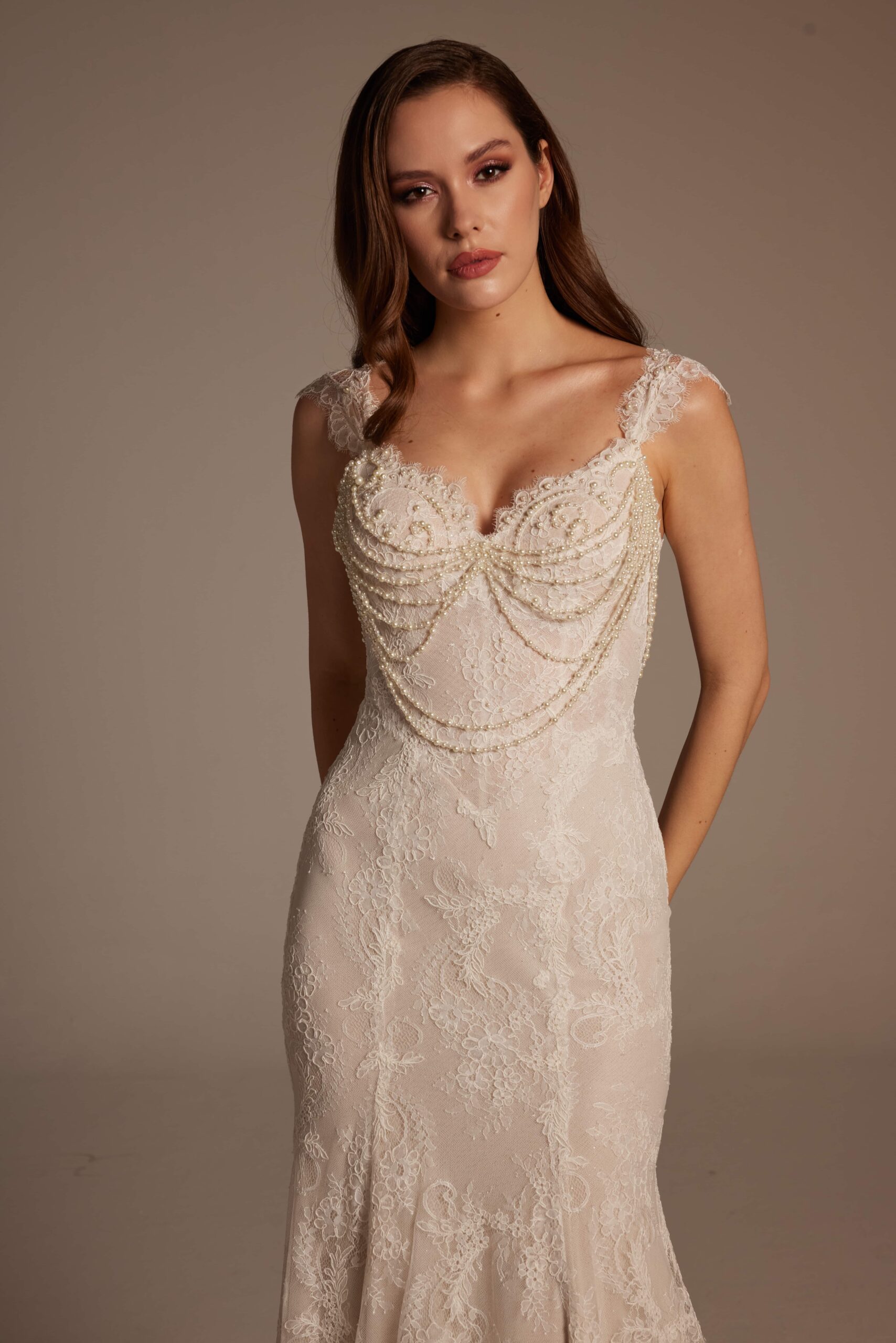 Straplez formda tasarlanan üst beden, göğüs hattında kullanılan ince dantel detaylarıyla romantik bir etki yaratıyor. Belden aşağı doğru vücudu saran balık kesim, diz hizasından itibaren yumuşak bir şekilde açılarak akıcı ve dengeli bir duruş sağlıyor. Tüm gelinlik boyunca devam eden zarif dantel işlemeler, ışıkla birlikte göz alıcı bir görünüm sunuyor.