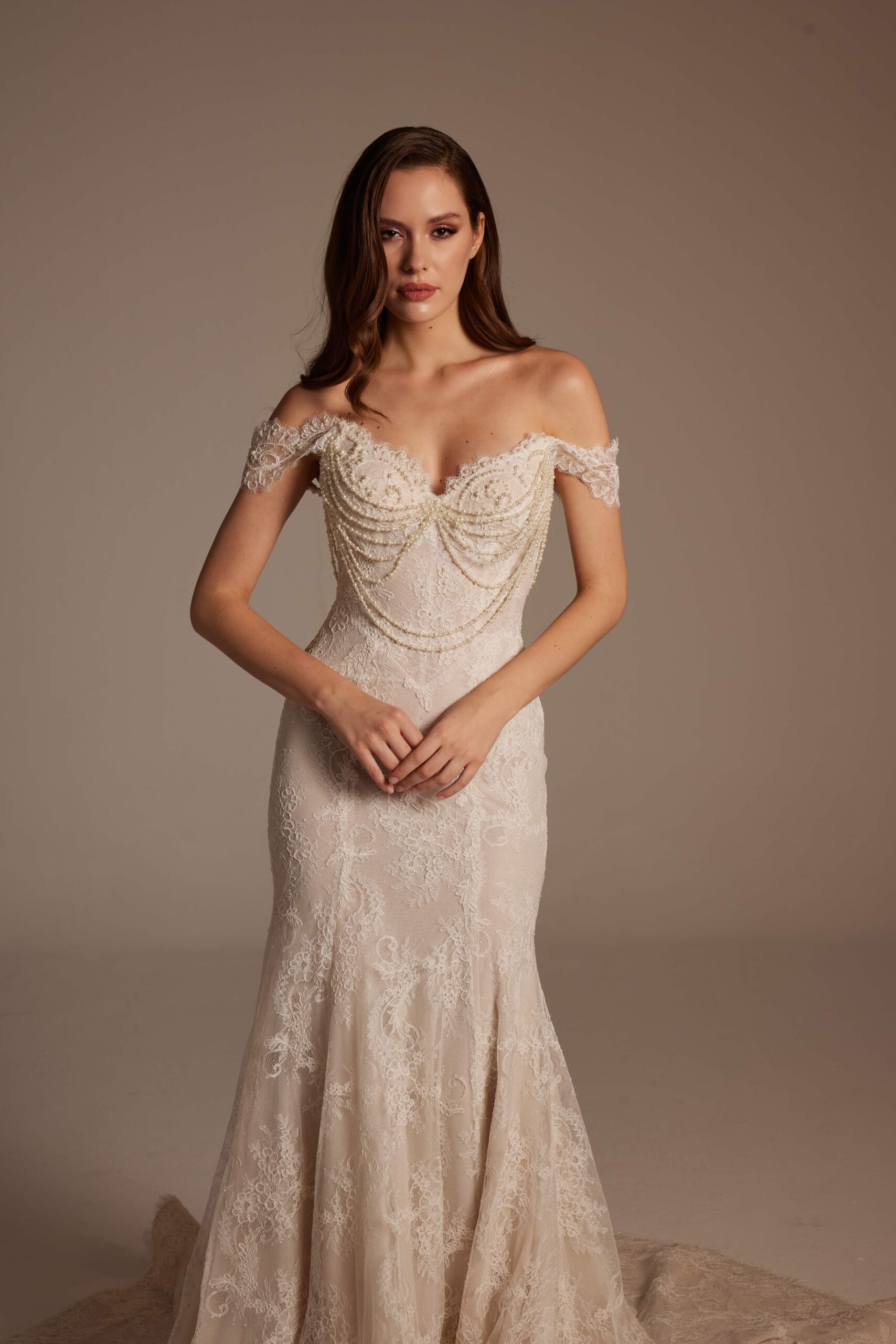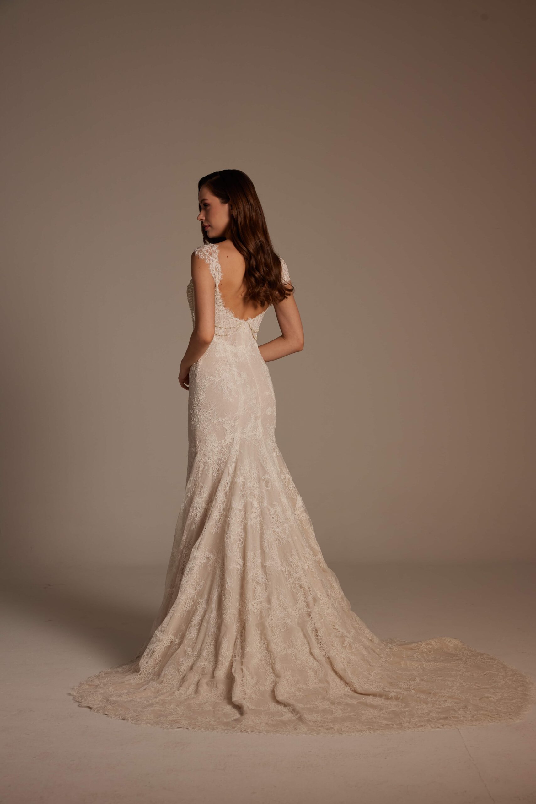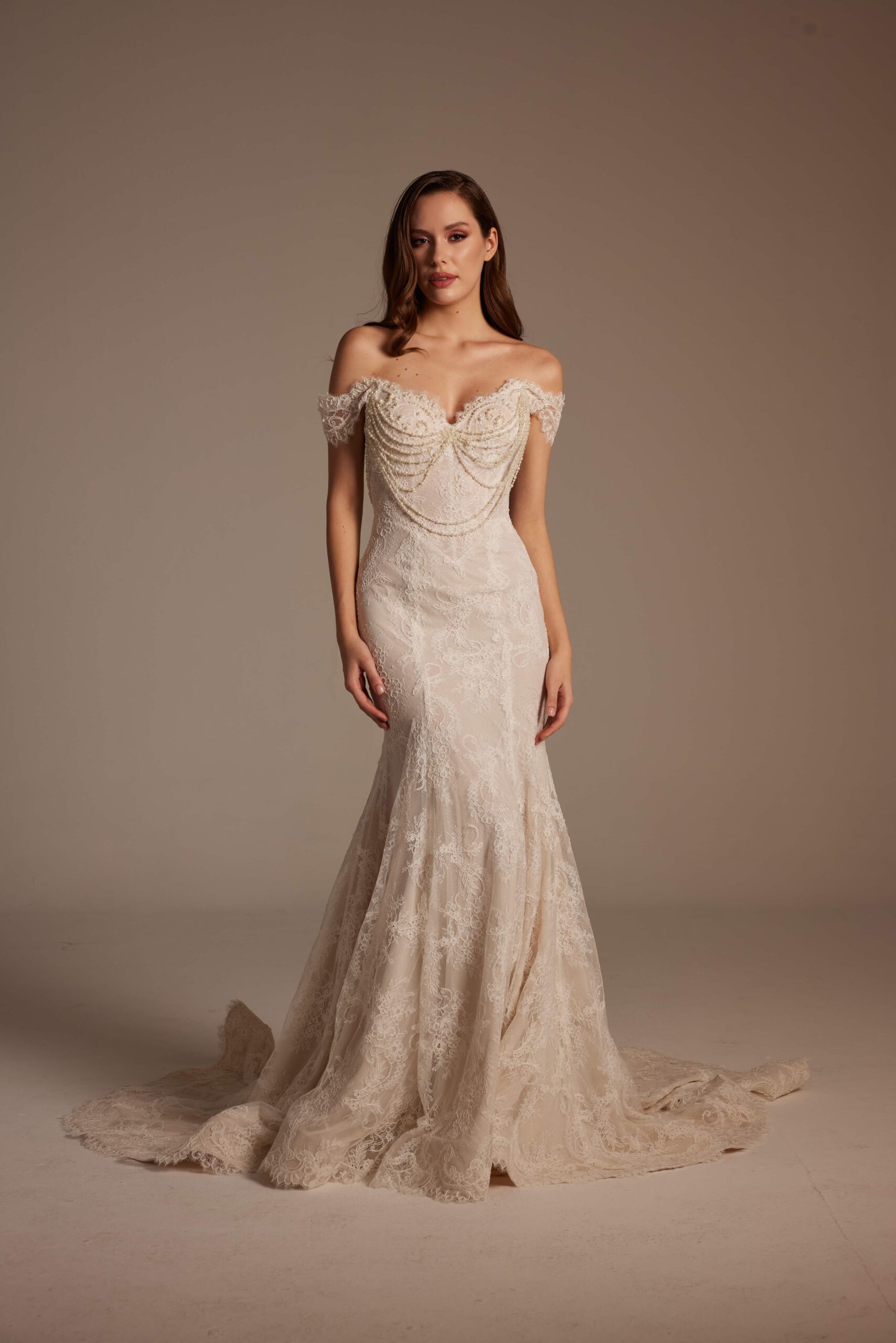 Straplez formda tasarlanan üst beden, göğüs hattında kullanılan ince dantel detaylarıyla romantik bir etki yaratıyor. Belden aşağı doğru vücudu saran balık kesim, diz hizasından itibaren yumuşak bir şekilde açılarak akıcı ve dengeli bir duruş sağlıyor. Tüm gelinlik boyunca devam eden zarif dantel işlemeler, ışıkla birlikte göz alıcı bir görünüm sunuyor.