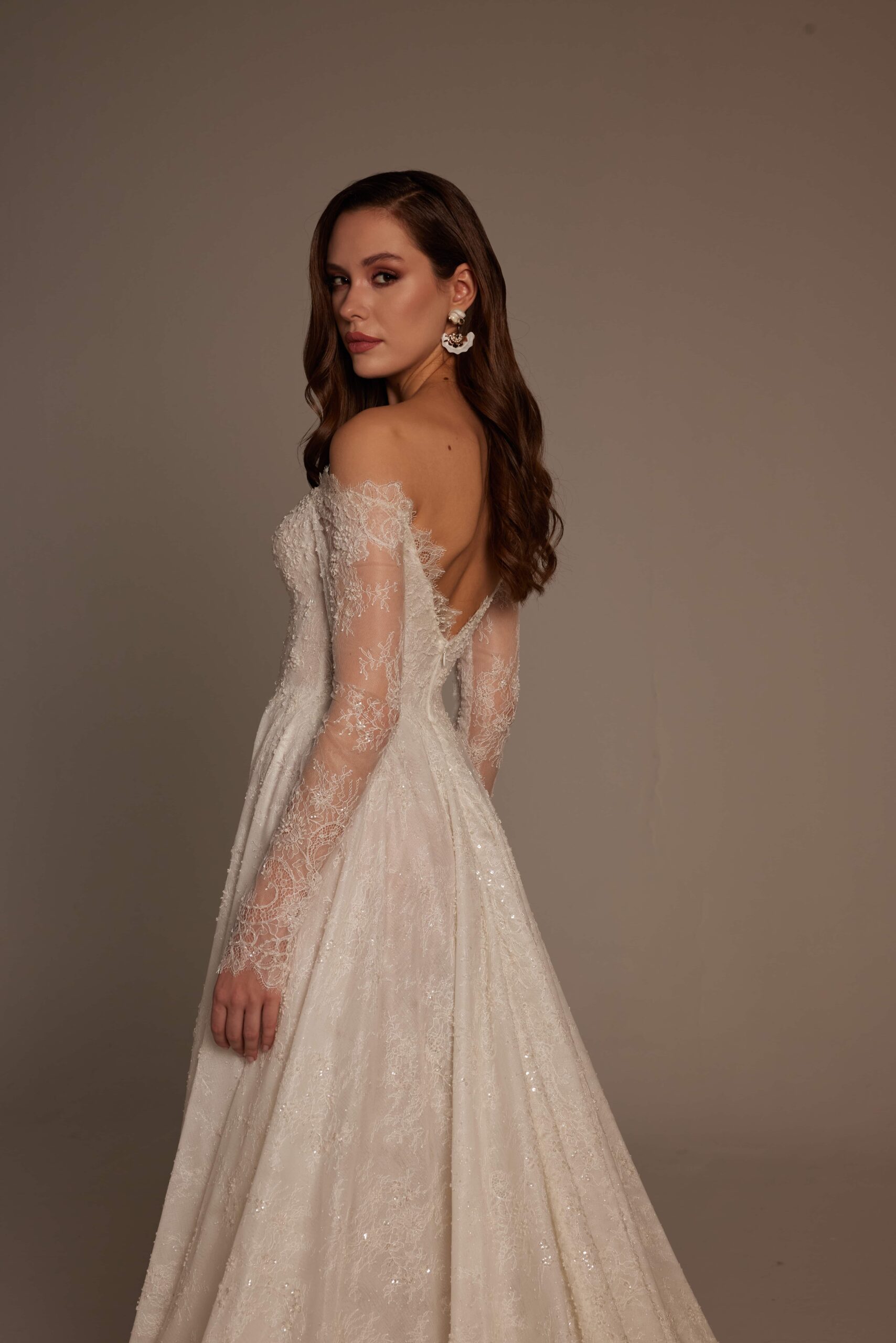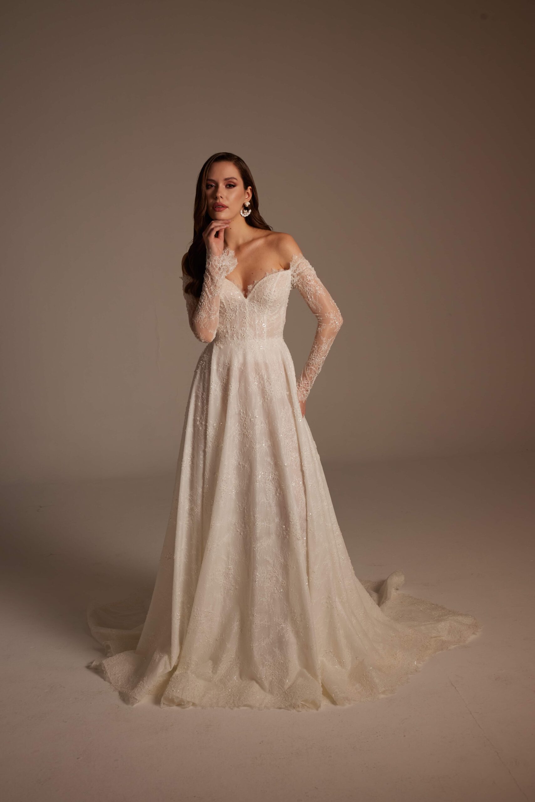 Merve Model, Nurcan Ege 2026 Gelinlik Koleksiyonu’nun romantik zarafeti sofistike detaylarla buluşturan özel tasarımlarından biridir. Omuzdan düşen transparan dantel kollar, gelinliğe yumuşak ve feminen bir ifade kazandırırken; derin V yaka formu dekolte hattını zarif ve dengeli bir şekilde öne çıkarır.
